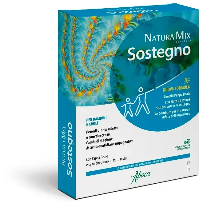 Natura Mix Advanced Sostegno è un prodotto 100% naturale validato dalle avanzate piattaforme scientifiche della Ricerca Aboca che hanno permesso di identificare le classi di sostanze contenute nel prodotto quali vitamine, lipidi, antocianine, altri flavonoidi, minerali e aminoacidi naturalmente contenuti in Pappa Reale e Cyanidin-3 (mix di frutti rossi).