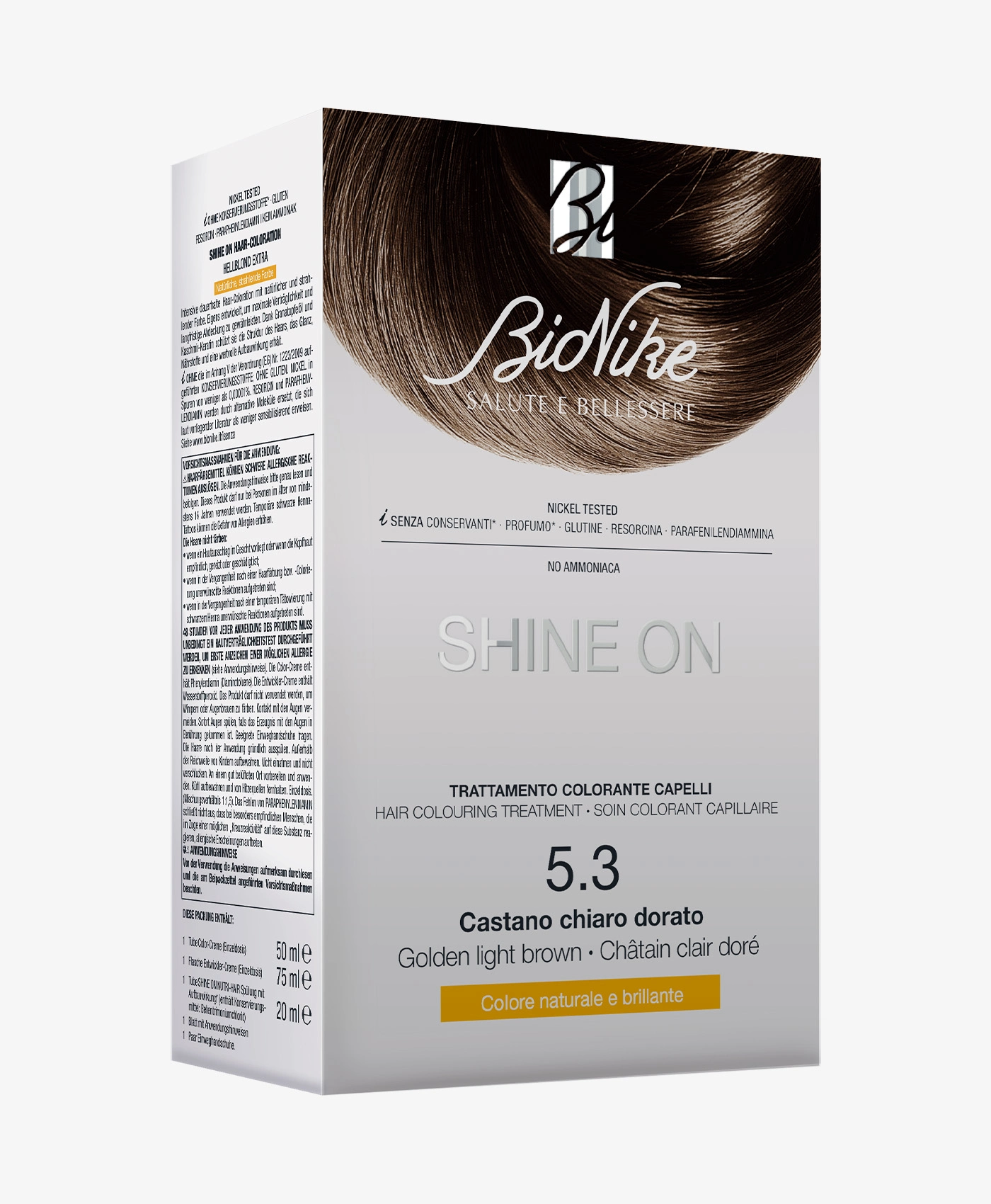 COLOURING CREAM: aqua (water), cocamide MEA, glyceryl stearate, cetearyl alcohol, stearic acid, ethanolamine, palmitic acid, toluene-2,5-diamine sulfate, glycerin, C12-13 alkyl lactate, p-aminophenol, bis-diglyceryl polyacyladipate-2, tri-C14-15 alkyl citrate, sodium hydrosulfite, ascorbic acid, tetrasodium EDTA, punica granatum seed oil, hydrolyzed keratin, hydrolyzed rice protein, decylene glycol, 1-naphthol, 2-methylresorcinol, 4-amino-2- hydroxytoluene, 2,4-diaminophenoxyethanol HCl, 4-chlororesorcinol, m-aminophenol, ethoxydiglycol, oxyquinoline sulfate.COLOUR REVEALER: aqua (water), hydrogen peroxide, cetearyl alcohol, laureth-3, ceteareth-20, hexyldecanol, hexyldecyl laurate,parfum (fragrance), etidronic acid, oxyquinoline sulfate.