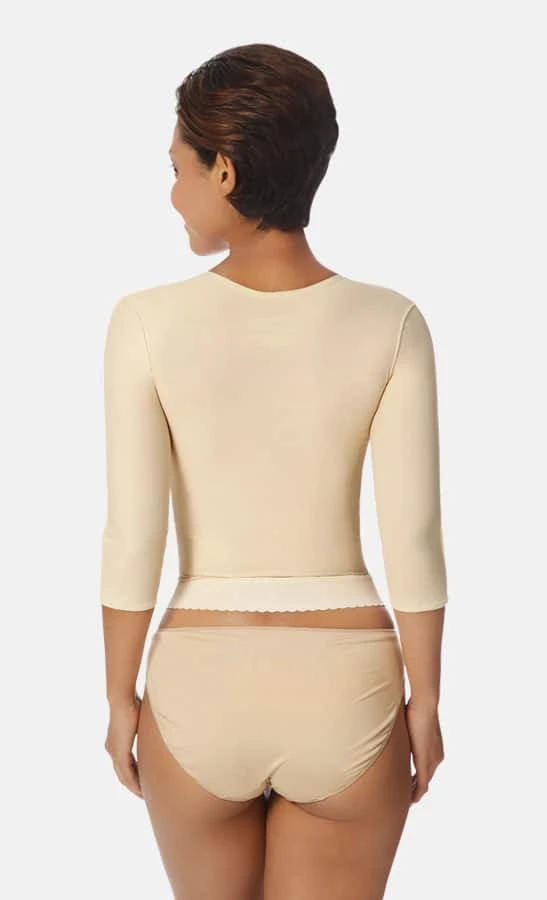 Corpetto compressivo con maniche a 3/4, pratico da indossare con una chiusura anteriore regolabile con ganci, ideale per il trattamento post operatorio di liposuzione delle braccia e della schiena, brachioplastica ed è indicato anche per post interventi di mastopessi o mastoplastica additiva o e riduttiva.Realizzato con il tessuto certificato F7 “Comfortweave”, che grazie alla sua forza ed elasticità aderisce al corpo come una seconda pelle; morbido e confortevole, traspirante e antimicrobico, qualità che fanno di questo tessuto un ottimo alleato della guarigione.