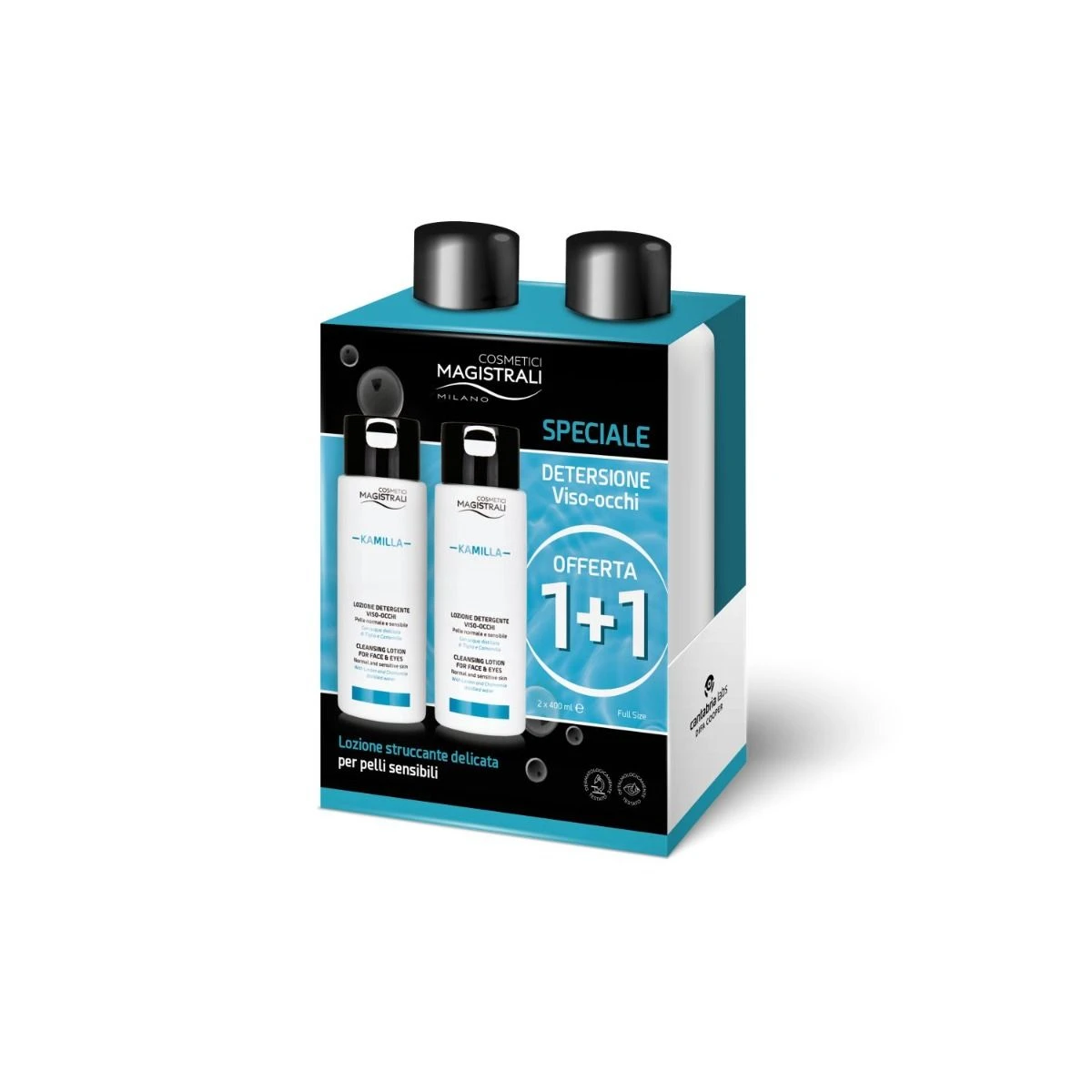 Il cofanetto contiene Kamilla lozione detergente viso – occhi 2 x 400 ml.