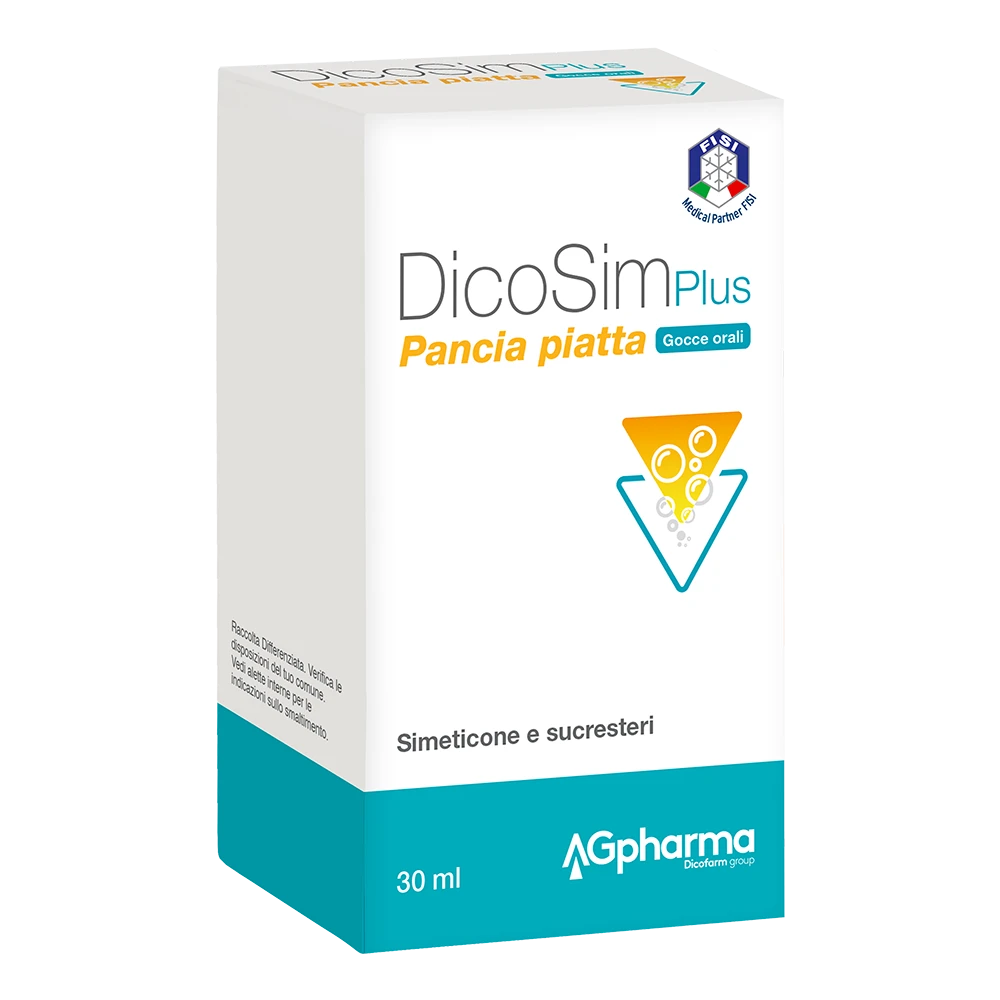 Le due sostanze funzionali contenute nel DicoSim Plus agiscono in maniera sinergica nel contrastare i sintomi associati alla sovrapproduzione di gas gastrointestinale, riducendo, conseguentemente, gonfiore e fastidi associati a disturbi dispeptici. Il Simeticone agisce come agente antischiuma, rompendo le bolle di gas formate sulla superficie dei fluidi gastrointestinali, e assorbendo il gas. I Sucresteri agiscono specificatamente sulla riduzione delle schiume proteiche presenti nel tratto gastrointestinale, ma sono anche capaci di ridurre la formazione della schiuma se il prodotto viene somministrato direttamente con il latte.