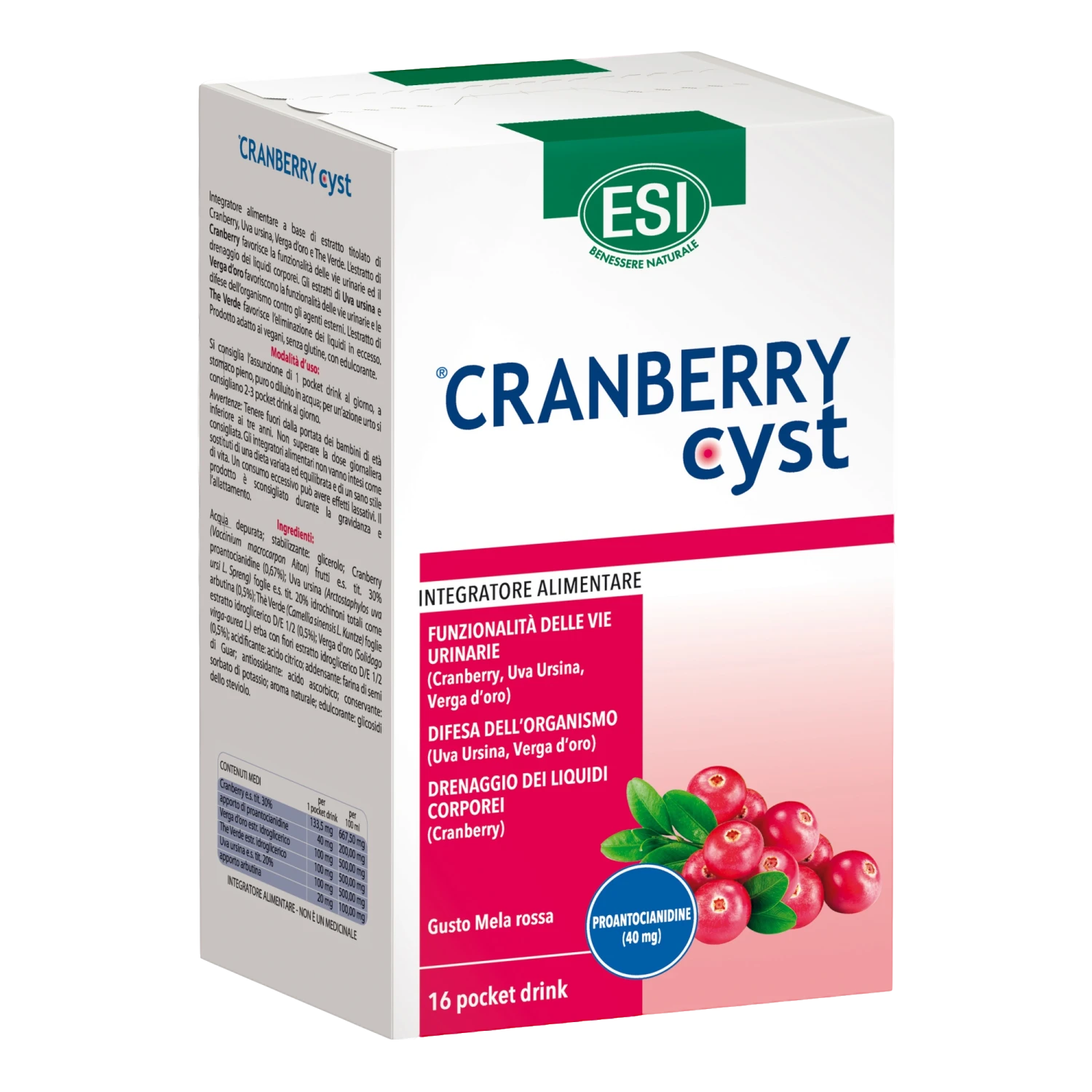 Il Cranberry o Mirtillo rosso americano è ricco di Proantocianidine, alimenti che favoriscono il drenaggio dei liquidi corporei e la funzionalità delle vie urinarie. Il Cranberry è utile anche per favorire le naturali difese dell’organismo e il benessere dell’ambiente vescicale. Nel pratico formato pocket drink puoi portarti sempre con te il prodotto e berlo diluito in acqua o direttamente puro.