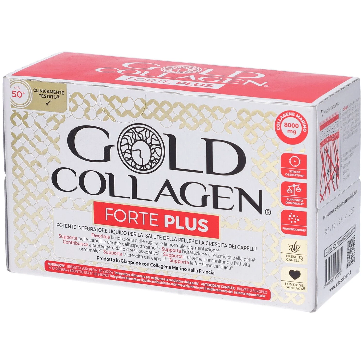 Acqua, collagene marino idrolizzato (pesce; esaltatore di sapidità: eritritolo; correttore di acidità: acido citrico; aromi, estratto di rucola (Eruca sativa Mill.) herba, polisaccaride di soia, vitamina C (acido L-ascorbico), vitamina E (D-alfa-tocoferolo)(emulsionante: lecitina di soia); correttore di acidità: acido malico; L-carnosina, estratto del frutto della vite (Vitis vinifera L.-trans-resveratrolo 5%), acido ialuronico, estratto di bacca di acai (Euterpe oleracea Mart.), coenzima Q10, olio di semi di borragine (Borago officinalis L.)(emulsionante: lecitina di soia), olio di primula notturna (Oenothera biennis L.), succo concentrato di melograno; edulcorante: glicosidi steviolici da stevia; gluconato di zinco, N-acetil-glucosamina (crostacei), biotina (D-biotina), beta-carotene, vitamina B6 (cloridrato di piridossina), piperina da pepe nero (Piper nigrum L.) frutto (Bioperine), tiamina (mononitrato di tiamina-vitamina B1), gluconato di rame, licopene, vitamina D (colecalciferolo), acido folico (acido pteroilmonoglutammico). Senza glutine.