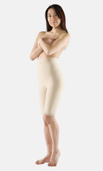 Guaina vita alta elasto compressiva da sotto il seno a sopra il ginocchio con funzionale apertura inguinale. Garantisce un’efficiente azione compressiva omogenea e costante ideale dalle 3 alle 8 settimane dopo l’intervento, in quanto non avendo zip e ganci è più facile da indossare, meno visibile e diventa un normale indumento intimo pur fornendo il giusto grado di sostegno e compressione consigliata. Particolarmente indicato a seguito di interventi quali addominoplastica, liposuzione addome, fianchi e cosce. Contiene la formazione di ematomi e gonfiori, accelera il graduale assestamento dei tessuti epidermici favorendo una corretta cicatrizzazione sottocutanea. Realizzato in tessuto F7 “ComfortWeave”, una nuova tecnologia rivolta al miglioramento dei 5 fattori chiave, importanti nel trattamento post operatorio. Un tessuto resistente, elastico, morbido, traspirante con proprietà antimicrobiche;composto dal 49% di filato elastico (Soft Lycra Spandex) ed dal 51% di filato rigido non elastico (Tactel Nylon). Aderisce “come una seconda pelle” garantendo un maggior senso di comodità e adattabilità, elementi preponderanti per indumenti compressivi che devono essere indossati 24 ore al giorno, 7 giorni a settimana per l’intera durata del periodo di recupero.