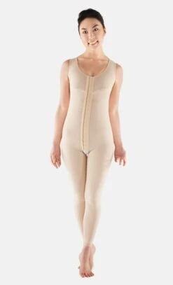 Guaina liposuzione con reggiseno senza maniche, lunghezza caviglia con bretelle regolabili, apertura inguinale e chiusura frontale con una fila di gancetti rivestiti da una patina protettiva per evitare il contatto diretto dei ganci sulla pelle, per un maggior senso di comfort. Ottima scelta dopo un intervento di addominoplastica, lipoaspirazione, liposuzione addome, fianchi, cosce, ginocchi, polpacci e glutei. Grazie anche ai ganci progettati e studiati per essere facilmente indossati direttamente sul tavolo operatorio ed in generale durante la vita quotidiana della prima fase di recupero, nello specifico consigliato l’utilizzo da subito fino a 3 settimane dopo l’intervento. Elemento importante per prolungarne l’utilizzo e la costanza è il tessuto scientificamente testato “F7 ComfortWeave”, risultato dell’innovazione tessile della Marena, un tessuto elastico, morbido, resistente, traspirante ed antimicrobico, un tessuto compressivo che aiuta a controllare e ridurre l’edema post operatorio abbinando al beneficio tecnico una piacevole sensazione di comfort. Il suo utilizzo garantisce notevoli benefici: riduce gonfiore ed edema, riduce la possibilità di infezioni e di ecchimosi, promuove la guarigione di ulcere causate da insufficienza venosa, ammorbidisce la pelle riducendo il dolore, migliora il comfort ed il sostegno aderendo come una seconda pelle. Disponibile in due colori beige e nero dalla taglia 2XS alla 4XL.