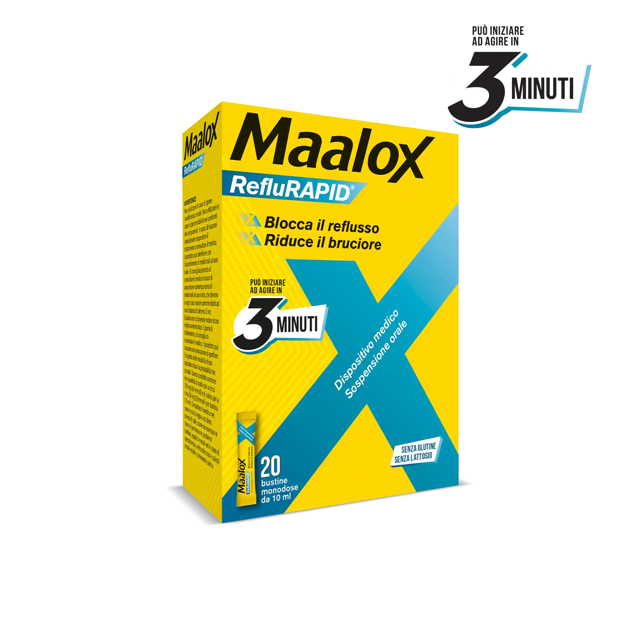 Maalox RefluRAPID è un dispositivo medico per il trattamento del reflusso gastroesofageo e del bruciore di stomaco. Contiene sodio alginato, bicarbonato di sodio, sodio carbonato e calcio carbonato che proteggono la mucosa dell’esofago dagli acidi.