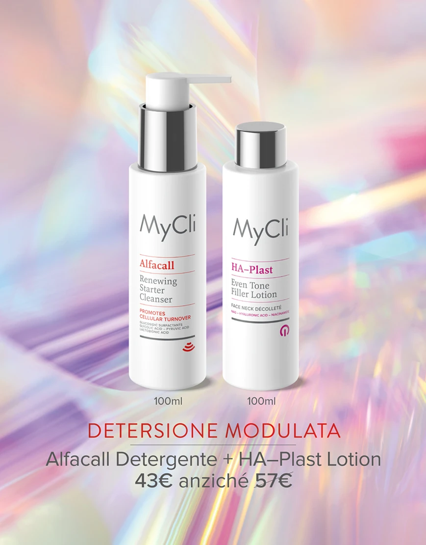 MyCli Alfacall Detergente Starter Rinnovatore è un gel leggermente schiumogeno, compatibile con i protocolli anti-aging MyCli. La sua formula a base di tensioattivi anionici e glucosidici, associa un complesso di alfa-idrossiacidi – Glicolico, Piruvico e Lattobionico – ad una molecola che rispetta l’equilibrio del film idrolipidico, per eliminare delicatamente i residui di sebo, trucco e polveri ambientali, favorire l’esfoliazione e preparare la pelle al trattamento rinnovatore Alfacall.
