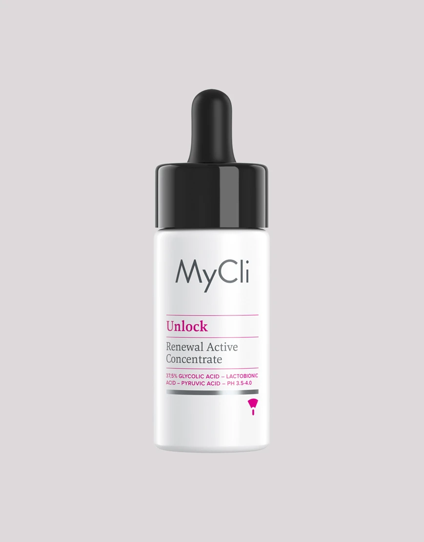 MyCli Unlock è una soluzione a base di acido glicolico, acido lattobionico e acido piruvico al 37,5% ad azione rinnovatrice e permeabilizzante dell’epidermide.