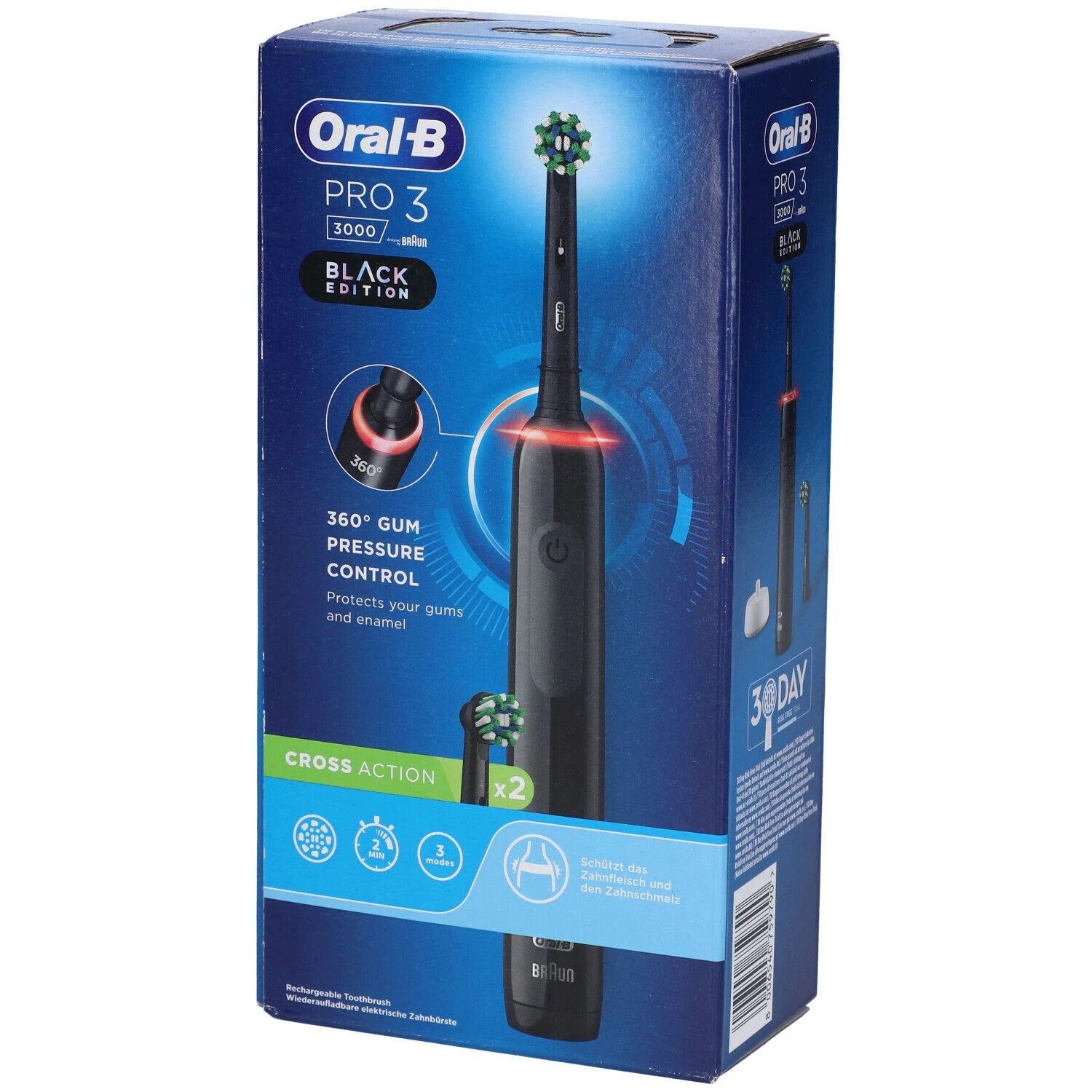 L’elegante manico dello spazzolino elettrico Pro 3 aiuta a spazzolare i denti per il tempo consigliato dai dentisti. Dotato di timer professionale, consente di spazzolare i denti per 2 minuti. Inoltre, grazie a un avviso ogni 30 secondi, é possibile sapere quando è il momento di passare all’area successiva. L’esclusiva testina rotonda di Oral-B pensa al resto. Rimuove fino al 100% di placca in più rispetto a uno spazzolino manuale tradizionale, per gengive più sane. Inoltre, agisce sulle macchie superficiali eliminandole, per un sorriso più bianco sin dal primo giorno. In più, grazie alla brevettata tecnologia di controllo della pressione di spazzolamento delle gengive a 360°, riduce la velocità e avvisa quando si spazzola in modo troppo aggressivo, aiutando a proteggere le gengive più delicate. Oral-B Pro 3 è la scelta ideale per tutti coloro che desiderano passare a uno spazzolino elettrico e migliorare la salute del cavo orale.