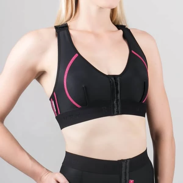 Revée® Bra Laetitia, dal look giovane, sportivo e vivace ma estremamente tecnico, con chiusura a ganci regolabili frontali e sulle spalline è dotato di rinforzi laterali per evitare lo scivolamento laterale della protesi e migliorare la medializzazione. Grazie alle particolari caratteristiche del materiale, le coppe si auto-modellano adattandosi perfettamente in caso di asimmetria delle mammelle. Per una migliore e corretta guarigione si consiglia inoltre l’utilizzo in combinazione con Revée®Belt per impedire lo scivolamento della protesi verso l’alto. Una volta terminato il periodo di compressione, usalo per le tue attività sportive (palestra, jogging). I Revée® Bra Laetitia ed Elodie possono essere facilmente indossati con comodità e sicurezza grazie alle chiusure poste sul davanti e sulle spalline.